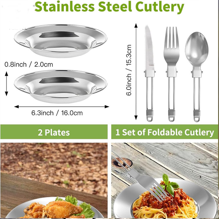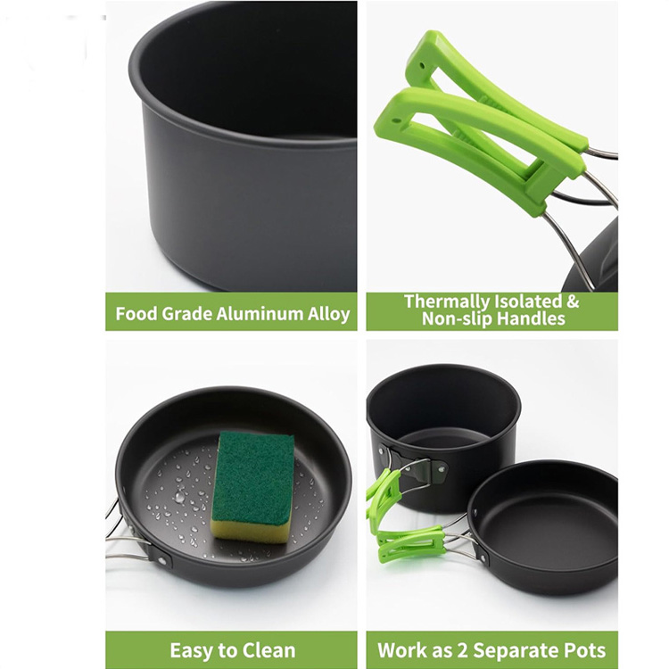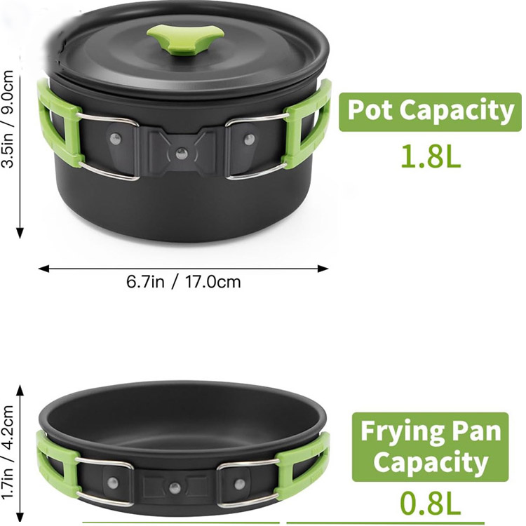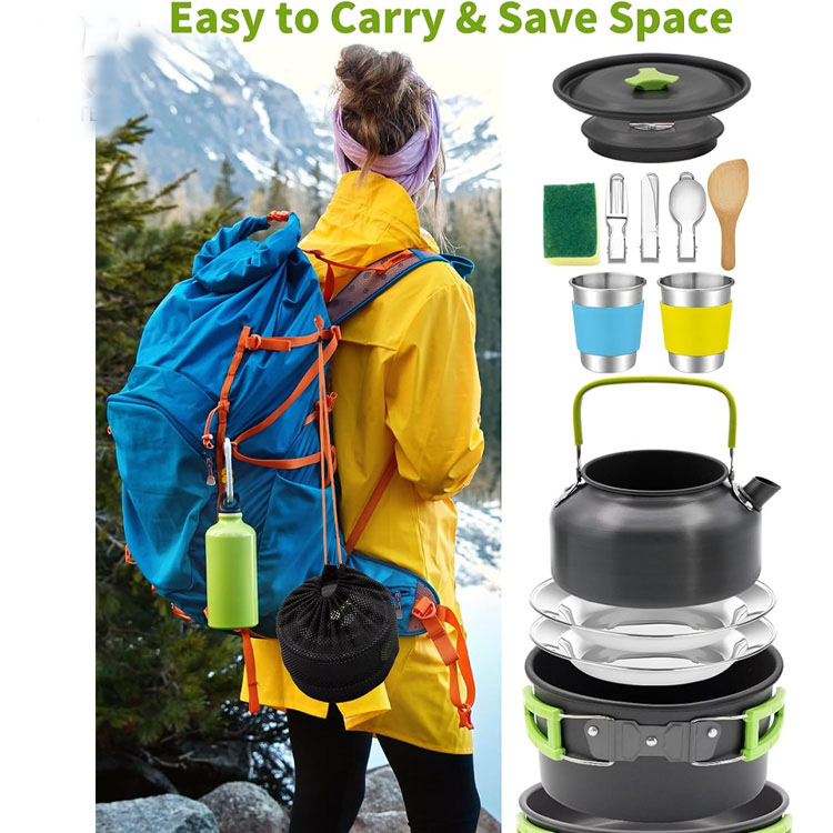 У цей комплексний набір входить усе необхідне для їжі на відкритому повітрі: каструлі, сковорідки, чашки, тарілки, виделки, ножі та ложки, що забезпечує повне кухонне рішення для пригод у кемпінгу.