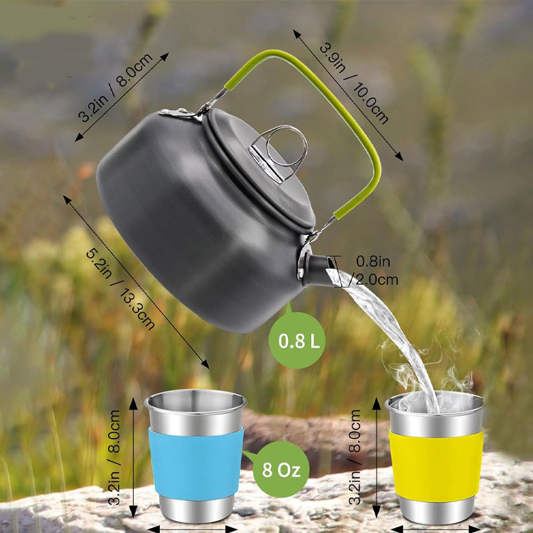 16 предметів кемпінгового посуду, кемпінгового набору для приготування їжі. Ваше повне рішення для кухні просто неба. Цей набір посуду для кемпінгу з 16 предметів включає каструлі, сковорідки, чашки, тарілки та посуд. Розроблений для комплексного харчування в кемпінгу, він забезпечує все необхідне для приготування їжі та обіду в пустелі.
