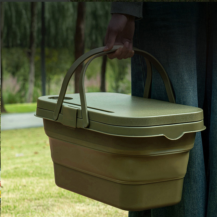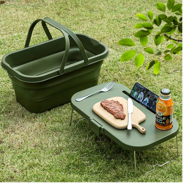 Кошик для кемпінгу на відкритому повітрі. Контейнер для зберігання для пікніка. Ваше найкраще портативне рішення для організації пригод на природі. Цей багатофункціональний складаний кошик поєднує в собі контейнер для зберігання та вбудовану поверхню столу. Виготовлений із міцного пластику, він ідеально підходить для кемпінгу, походів і пікніків.