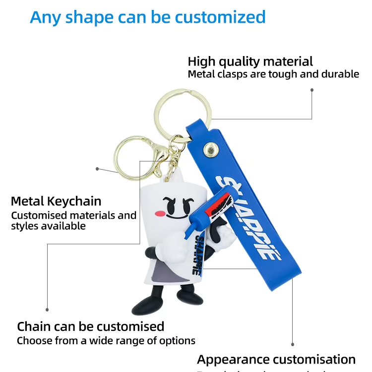 Втілюйте свій бренд або ідею в життя за допомогою повністю налаштованого 2D або 3D дизайну. Незалежно від того, чи це логотип, талісман чи слоган, наші м’які брелоки з ПВХ розроблені відповідно до вашого бачення завдяки яскравим кольорам і високій деталізації.