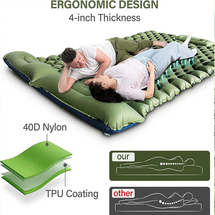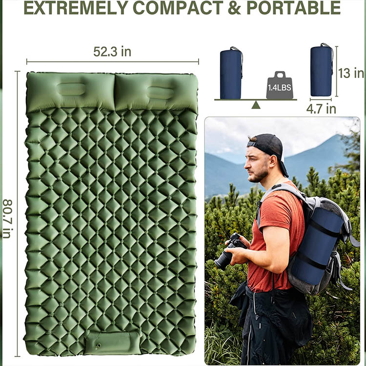 Двомісна надувна надувна накладка для кемпінгу. Неперевершений подвійний комфорт для пригод на природі. Цей надувний кемпінг для двох осіб пропонує просторе місце для сну з інноваційною конструкцією для запобігання ковзанню. Будучи надлегким рішенням, воно забезпечує неперевершену портативність і спільний комфорт для пар і друзів у кемпінгу.