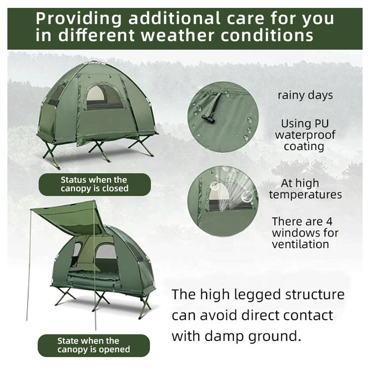 Має вбудовану підняту платформу для сну, яка поєднує захист від вологи та підвищений комфорт, ефективно відокремлюючи вас від вологої землі та покращуючи ізоляцію.