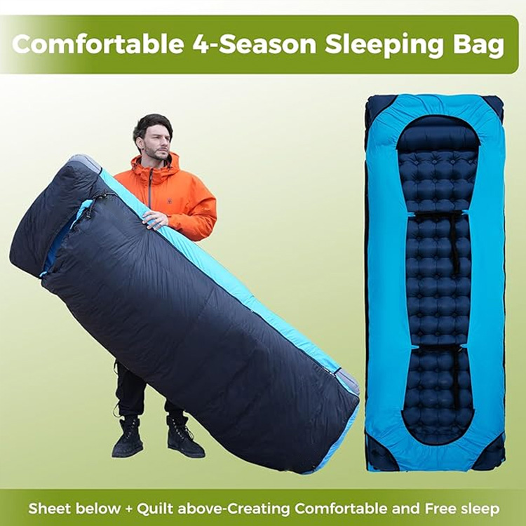 Надлегка пухова кемпінгова ковдра з качиним пухом для сну. Ваша найкраща чотирисезонна система сну для пригод у пустелі. Цей надлегкий пуховий спальний мішок поєднує преміум-ізоляцію з качиного пуху та вбудовану надувну підкладку. Функціонуючи одночасно як ковдра і спальний мішок, він забезпечує максимальне тепло без шкоди для ваги.