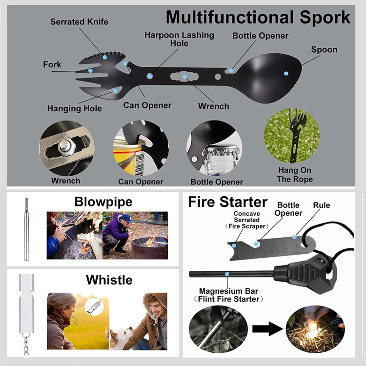 Цей універсальний набір ретельно підібраний для різноманітних сценаріїв і містить необхідні інструменти для кемпінгу в дикій природі, тривалих туристичних походів, екскурсій на риболовлю та полювання на велику дичину.